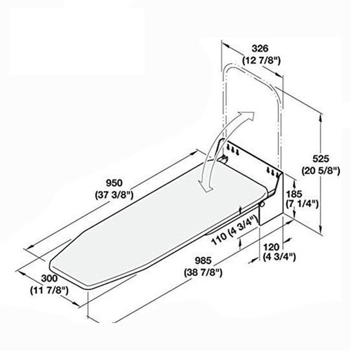 100cm (L) x 31cm (W) when in use position. Equipped with a turning mechanism, the board can be turned to the left or right up to 90 degrees, for a range of 180 degrees. Steel with cloth ironing cover
